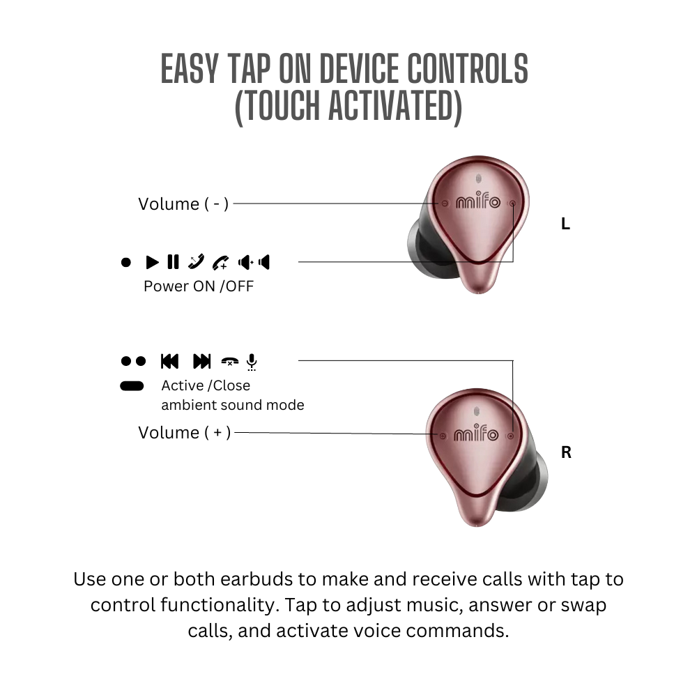 - Independent usage and voice functions with multi-microphone technology. Use one or both earbuds to make and receive calls with tap to control functionality. Tap to adjust music, answer or swap calls, and activate voice commands.
