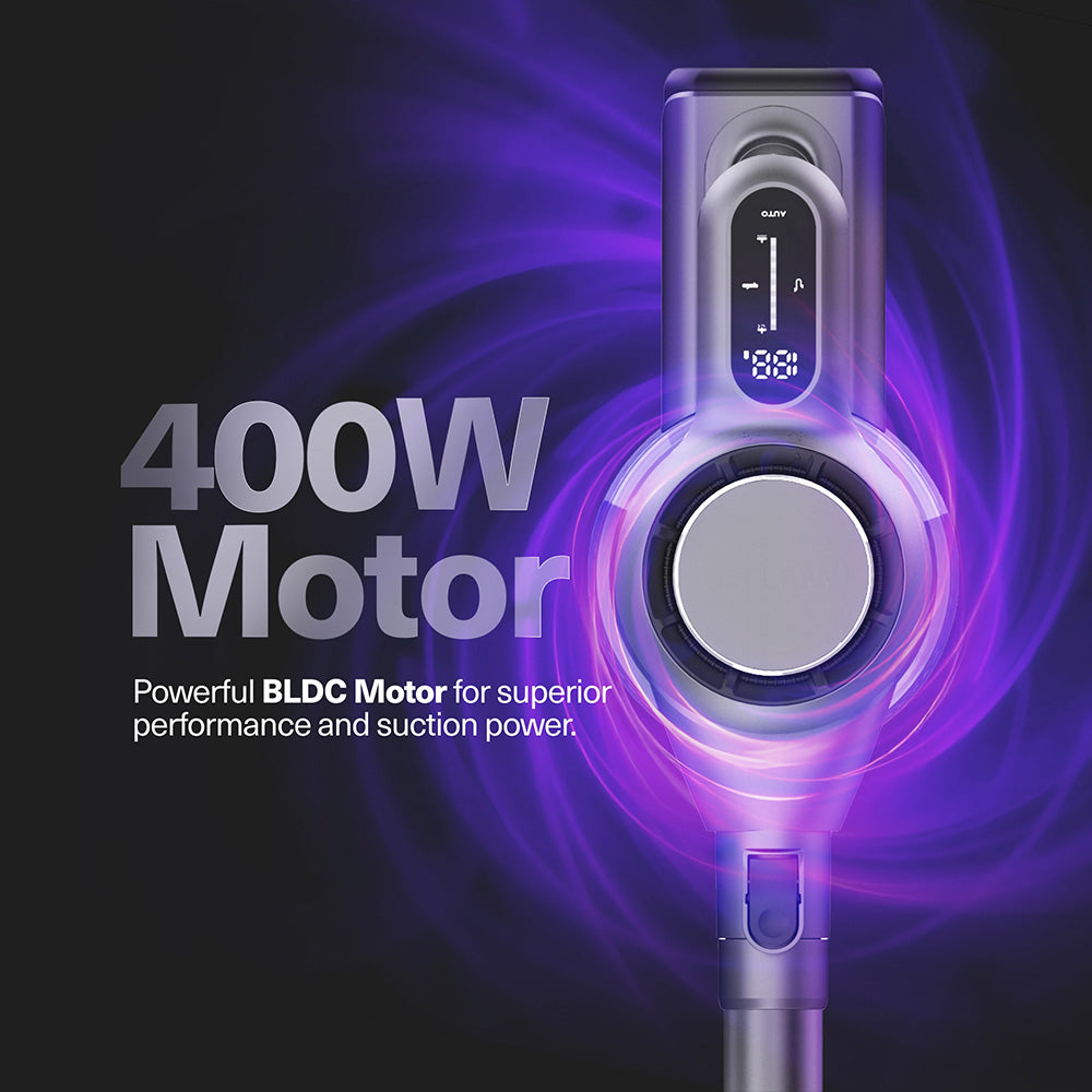 - The power to deep clean. With a 400W brushless motor and true 12,000Pa suction instantly captures debris, dust, crumbs, pet hair, and other messes with ease. The brushless motor generates less heat and noise (63db), which results in more energy-saving and longer service life, compared with other regular brushed motors.