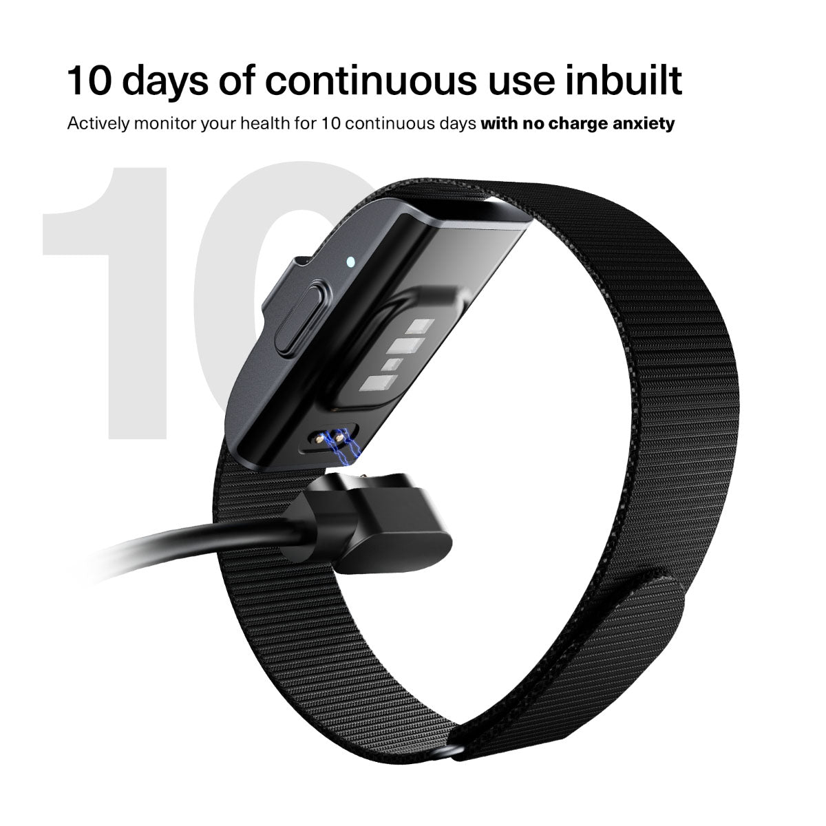 - 10-day battery life. Never worry about missing a day of tracking your progress with a stunning 10 days of use before recharging. Ships with rapid charge dock so you won't miss monitoring key body data.